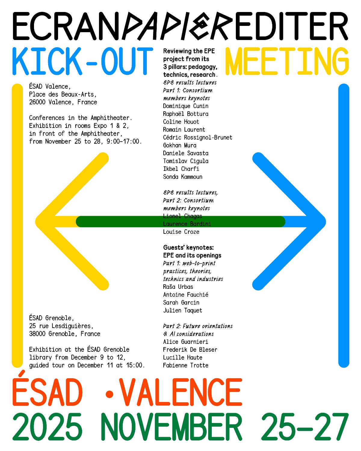 The Ecran-Papier-Editer (EPE) project was set up in December 2023 with the research unit “Designing tools, tools for design” at ESAD•GV, in collaboration with a consortium of five partners around an interdisciplinary and cross-sectoral project. Due to the hegemony of a few editing tools, page layout of online content offers no real choice of design. We believe that open source tools can widen design possibilities by leveraging web technologies. Moreover these new tool chains take into account ecological issues by enabling a fine-tuned selection of what is to be published on paper. At the crossroads of the professions, the arts and the professional branches of culture, EPE sees itself as a conceptual and practical toolbox for designing new publishing software under an open licence produced with the aim of alternative and creative communication between screen and paper.